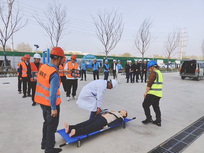 本次演練共分6個小組,分別為:現(xiàn)場模擬組、現(xiàn)場警戒(搶修)組、應急救援(疏散)組、通訊聯(lián)絡組、事故調(diào)查組、 觀摩組。假設工人在生活區(qū)違規(guī)使用大功率電器突發(fā)火災,被煙霧和火勢圍困,二樓有人發(fā)出救援信號,正在附近巡查的安全員發(fā)現(xiàn)情況后,立即趕赴現(xiàn)場并打電話給項目生產(chǎn)負責人,在接到通知后,項目生產(chǎn)負責人迅速安排項目部應急救援辦公室負責人,并啟動應急預案,各救援小組立即到達現(xiàn)場開展工作,安全員迅速引導全體人員有序從疏散樓梯疏散到安全位置,救援組帶著擔架、急救箱等趕赴現(xiàn)場,將“受傷”人員用擔架從房內(nèi)撤離到安全位置,同時救援醫(yī)生對“受傷”人員進行簡單的心肺復蘇、人工呼吸,并迅速送往醫(yī)院進行治療。