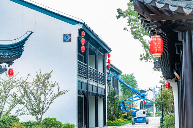 2023年9月25日,蘇宿工業(yè)園區(qū)蘇州街,工人們正在掛燈籠,喜迎中秋、國慶雙節(jié)到來。大紅燈籠與白墻青瓦綠樹相映成趣,成為一道靚麗的風景線,營造了歡樂、喜慶、祥和的節(jié)日氛圍。