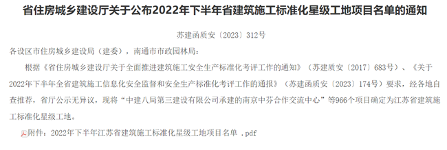 近期,省建設(shè)廳下發(fā) 《 關(guān)于公布2022年下半年江蘇省建筑施工標(biāo)準(zhǔn)化星級(jí)工地公示名單 》的通知,城發(fā)公司投資建設(shè)的青年公寓一期土建及安裝工程喜獲“江蘇省建筑施工標(biāo)準(zhǔn)化星級(jí)工地”(二星)稱號(hào)。該榮譽(yù)的獲得是公司扎實(shí)推進(jìn)省安全生產(chǎn)標(biāo)準(zhǔn)化建設(shè),落實(shí)上級(jí)關(guān)于推進(jìn)安全生產(chǎn)標(biāo)準(zhǔn)化建設(shè)工作部署的要求,建立健全管理機(jī)制,積極開展安全文明標(biāo)準(zhǔn)化工地創(chuàng)建所取得的成果,為全省樣板化示范,有效提升建筑施工水平,安全生產(chǎn)發(fā)揮了引領(lǐng)作用。