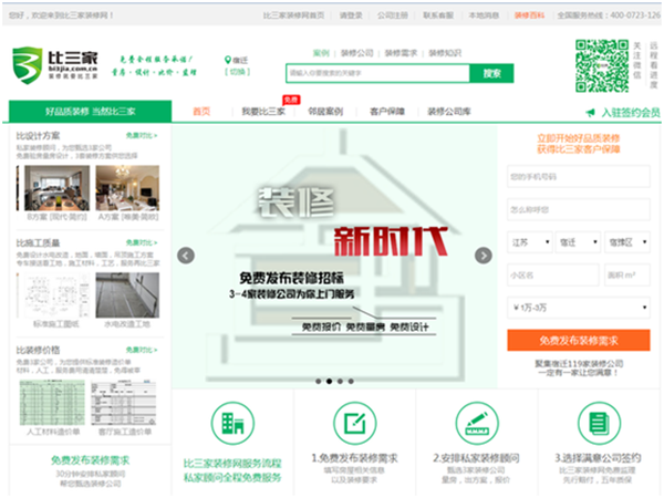 比三家裝修網(wǎng)于2015年10月份落戶蘇宿電子商務(wù)產(chǎn)業(yè)園,該裝修網(wǎng)定位于“互聯(lián)網(wǎng)+”大眾創(chuàng)業(yè)平臺,是一家扎根于三線城市,以“中介生意”模式幫助傳統(tǒng)的裝修行業(yè)的公司利用互聯(lián)網(wǎng)接到更多的訂單,幫助用戶找到合適的裝修公司。網(wǎng)站通過好品質(zhì)裝修,比設(shè)計方案、比施工質(zhì)量、比裝修價格,為用戶提供符合比三家裝修網(wǎng)標準的服務(wù)。